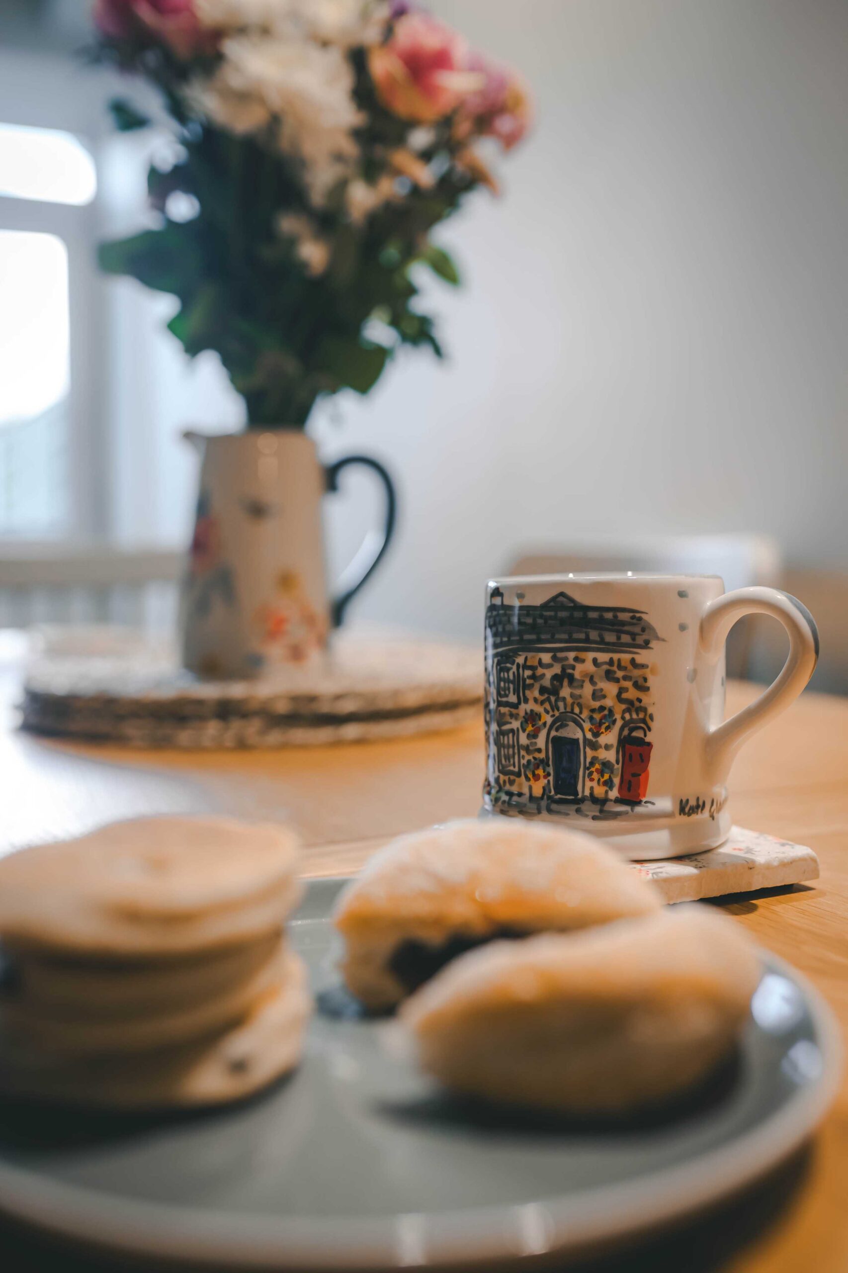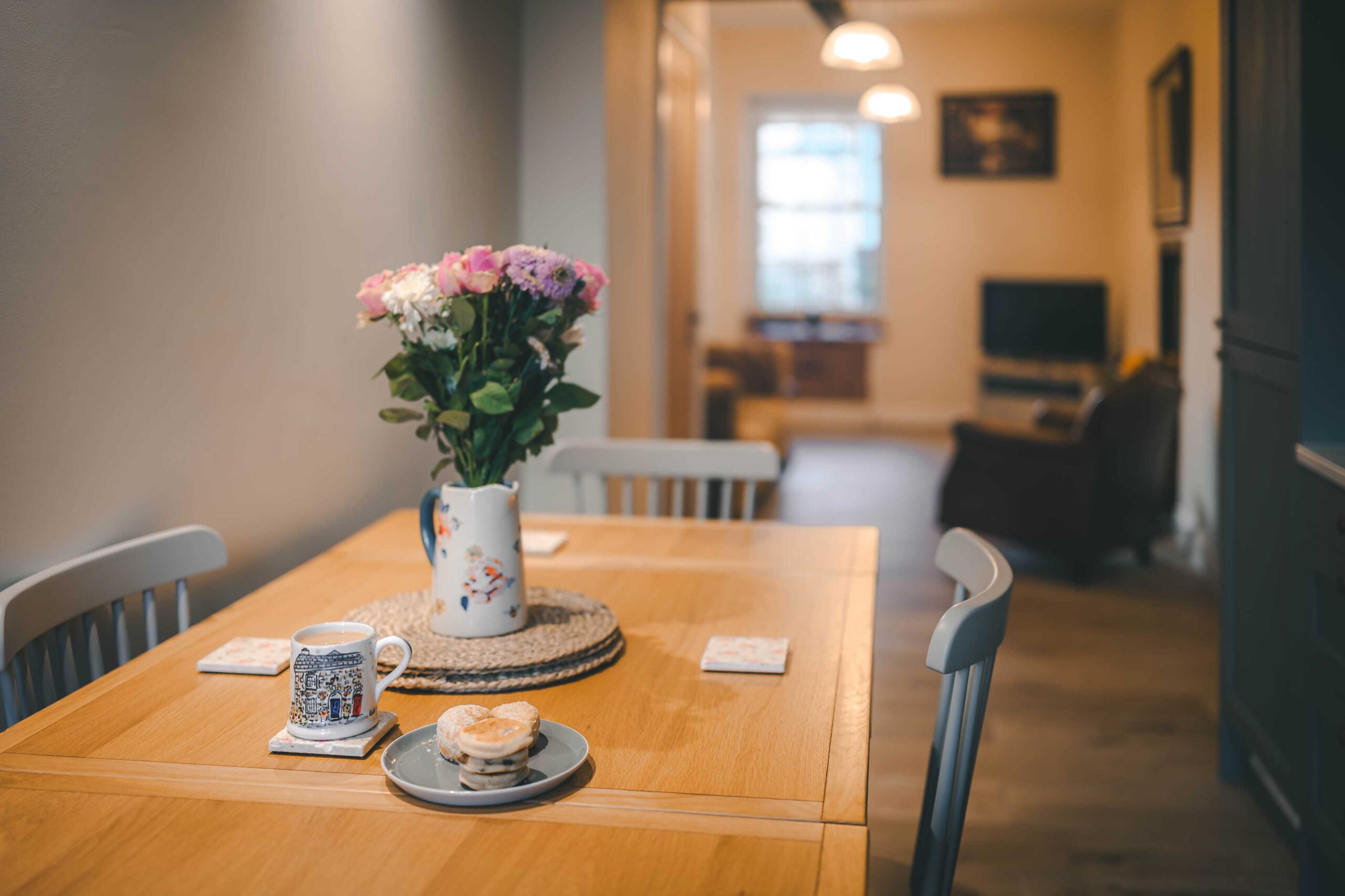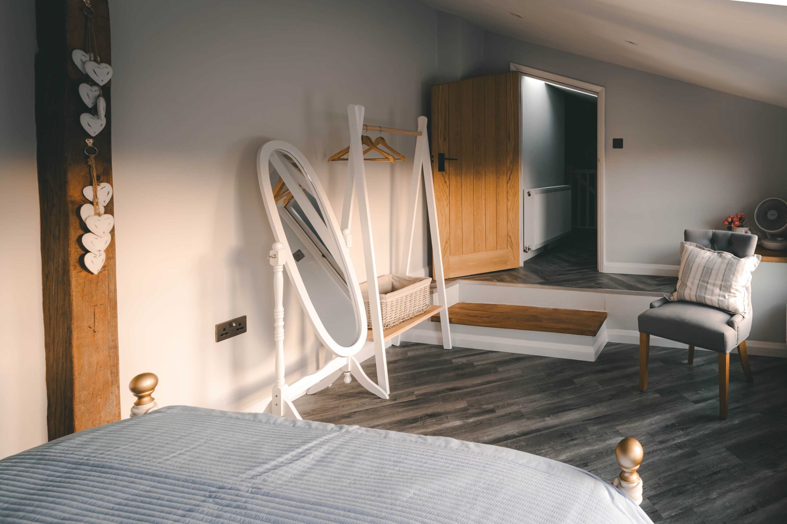 Living Spaces: Bright and welcoming interiors featuring exposed beams, cosy seating areas, and warm finishes.